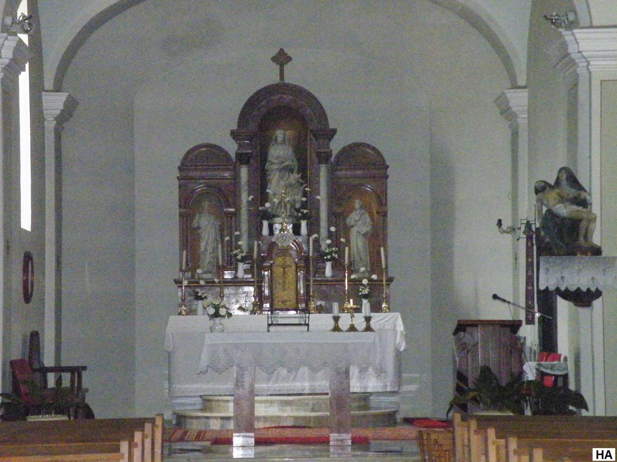 Korábban egy fából faragott oltár díszítette a templomot, amely az 1856-os tűzvészben elpusztult. A utolsó felújítási munkák során az egyik falban megtalálták elszenesedett maradványait, valamint egy szintén elszenesedett angyal szobrot. A templom akkori teljes berendezése valószínűleg fából készült. Ma is látható azonban két ilyen szobor, melyeket a keszthelyi Balaton Múzeumban újítottak fel, és ugyanitt egy kiállításon is részt vettek, míg a templom felújítási munkálatai folytak. Az egyik a bal oldalt az egykori szószéket tartó vörös márványoszlopon található szentháromság szobor, vele egyvonalban jobbra pedig a piéta.